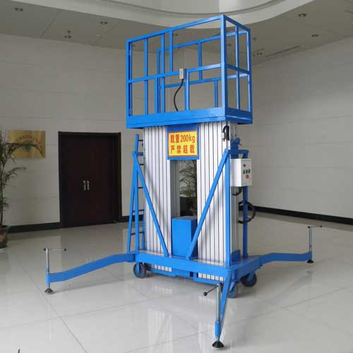 鋁合金升降機采用高強度優質鋁合金材料,具有造型美觀、體積小、重量輕、運轉靈活,推行方便。升降平穩、安全可靠等優點。它輕盈的外觀,能在極小的空間內發揮最高的舉升能力。廣泛用于工廠、賓館、餐廳、車站、影劇院、展覽館等場所,是保養機具、油漆裝修、調換燈具、電器、清潔保養等用途的最佳安全伴侶。